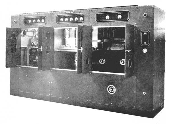 This transmitter had both continuous wave and modulated continuous wave capability. The motor alternator shown on the transmitting room layout gave about 750 watts at 1000 cycles (Hz) for MCW use with the medium wave transmitter. The motor alternator was started and controlled from the power board. Again, frequency selection of the transmitter was by telephone dialling.