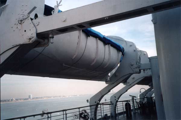History of Use1936-1939 – The lifeboats and other devices were in place as described above. Lifeboat drills were a routine at the beginning of every voyage. The lifeboats were never required to be put in use because of an emergency on the Queen Mary. 1940-1946 – The Queen Mary was used as a troop transport during World War II. Her carrying capacity was increased from approximately 2,000 passengers and 1,000 crew in stages to over 16,000 serviceman and crew. Six extra lifeboats were added to the ship in the aft area alongside the engineers quarters and the Verandah Grill. Two more were added in the area behind the forecastle. In addition at least 6 Carley floats (rubber rafts) were kept on the sun deck just behind the Verandah Grill and numerous life floats were carried on the upper decks. 1947-1967 – In the postwar refit (1947) all of the lifeboats added during the war were removed with the exception of a single extra lifeboat on the starboard side alongside the engineers' quarters. It was retained along with its quadrant davits.