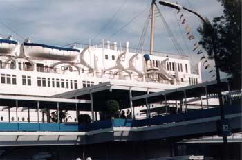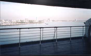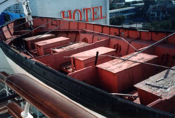Deckplan edited by author to show today's arrangement. Since 1971 two of the 24 boats held in the original davits have been lost or destroyed. During a demonstration of the lifeboat drill for tourists, the boat in position 23 broke loose from the cables and fell to the water and was damaged or destroyed. The boat then in position # 24 was shifted in its place. It is now used for this demonstration although it is not an original Queen Mary lifeboat. In the early 1990’s while Disney operated the Queen Mary, the lifeboat in position # 22 was removed with the intent of creating a mold to replicate some or all of the 36ft. boats. This project was not complete when Disney left the Queen Mary in late 1992. The boat was left on property, but was not re-hung. The current location of this lifeboat is unknown. During the Disney era at the Queen Mary (1987-1992) the white canvas tarps in use on the lifeboats were replaced by bright blue tarps. Early photographs of the Queen Mary indicated that they were originally a buff/tan in color. Restoration Potential and PlansThe present plan is to continue with the patch and paint approach to the remaining lifeboats. There are no plans for restoration of existing or replacement of the two lost lifeboats. The photos below were taken by the author Dec 29, 2001. Click on any photo to expand it to full-size.